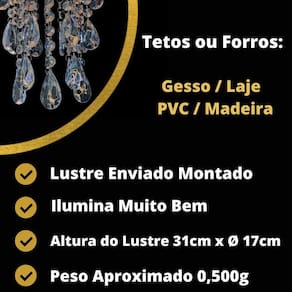 Especificações do produto: Base plafon octogonal de 17 cm em acrílico na cor branca; Altura do lustre 31 cm; Castanhas de acrílico transparente; Argolas de inox não enferrujam ; Voltagem: Bivolt 127v 220v; Bocal para lâmpada modelo E27. Lustre enviado montado pronto para instalação. Lâmpada não inclusa.