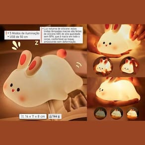 Deixe seus ambientes ainda mais encantadores com esta luminária em formato de coelhinho, perfeita para quem ama decoração criativa, divertida e acolhedora. Design delicado, toque macio e um brilho suave que conquista crianças e adultos.