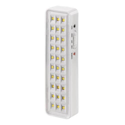 Luminária De Emergência Branco Iluminação Recarregável A luminária 30 LEDs foi fabricada com a tecnologia LED, desenvolvida para iluminação de emergência. Pode ser utilizada em ambientes internos e é ideal para escritórios, hotéis, restaurantes, estabelecimentos comerciais, residências entre outros. Possui bateria de lítio, que proporciona uma vida útil mais longa e uma melhor performance do produto. Seu design moderno foi pensado para que se adeque aos mais diversos ambientes, harmonizando com a arquitetura do espaço e trazendo ainda mais elegância ao projeto. Econômica, proporciona autonomia com maior durabilidade e ótima iluminação. Pode ser facilmente instalada, manuseada e transportada. Acende automaticamente na falta de energia elétrica. Informações TÉCNICAS: Fluxo luminoso máximo: 100 lúmens Quantidade de LEDs: 30 Área de Cobertura: 25m Led indicativo de funcionamento: Sim Seleção de fluxo máx. E min.: Sim Bateria: 3.7 V 500 mAh Alimentação: 100-240 V 50-60 Hz Consumo de energia: 1 W Autonomia: 2,5 horas máx//5 horas mín Temperatura de operação: -10C a 60 C 01h70C Temperatura de cor do LED: 5700 K - 8000 K Grau de proteção: IP20 Peso: 125 g Dimensões: 175 x 49 x 25 mm Materiais de construção: PP/PS Botão de teste: Sim Marca: Não Informado