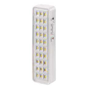 Luminária De Emergência Recarregável 30 LEDs Lanterna A luminária 30 LEDs foi fabricada com a tecnologia LED, desenvolvida para iluminação de emergência. Pode ser utilizada em ambientes internos e é ideal para escritórios, hotéis, restaurantes, estabelecimentos comerciais, residências entre outros. Possui bateria de lítio, que proporciona uma vida útil mais longa e uma melhor performance do produto. Seu design moderno foi pensado para que se adeque aos mais diversos ambientes, harmonizando com a arquitetura do espaço e trazendo ainda mais elegância ao projeto. Econômica, proporciona autonomia com maior durabilidade e ótima iluminação. Pode ser facilmente instalada, manuseada e transportada. Acende automaticamente na falta de energia elétrica. Informações TÉCNICAS: Fluxo luminoso máximo: 100 lúmens Quantidade de LEDs: 30 Área de Cobertura: 25m Led indicativo de funcionamento: Sim Seleção de fluxo máx. E min.: Sim Bateria: 3.7 V 500 mAh Alimentação: 100-240 V 50-60 Hz Consumo de energia: 1 W Autonomia: 2,5 horas máx//5 horas mín Temperatura de operação: -10C a 60 C 01h70C Temperatura de cor do LED: 5700 K - 8000 K Grau de proteção: IP20 Peso: 125 g Dimensões: 175 x 49 x 25 mm Materiais de construção: PP/PS Botão de teste: Sim Marca: Não Informado Ean: 7905609825951