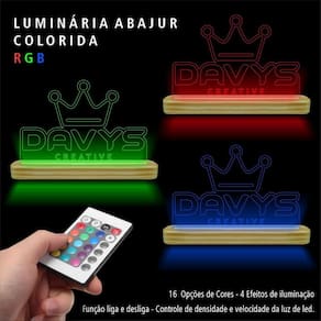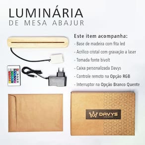 Decore e ilumine seu ambiente com muito estilo e personalidade. Ótima opção para quem deseja decorar o ambiente com muito bom gosto e deixar sua casa ainda mais bonita. A arte de decorar vai deixar o seu espaço mais acolhedor, moderno e, principalmente, com a sua cara. Características: - Base de madeira com fita led - Acrílico com gravação a laser - Tomada Bivolt - Controle remoto no produto com a Opção RGB Especificações técnicas: Marca: Davys Creative Modelo: Luminária Abajur Cor opcional: RGB colorido Ambientes Recomendados: Interno Acompanha Caixa personalizada Davys Dimensões: 25x17x5 : 30 dias FABRICAÇÃO PRÓPRIA Marca: Não Informado
