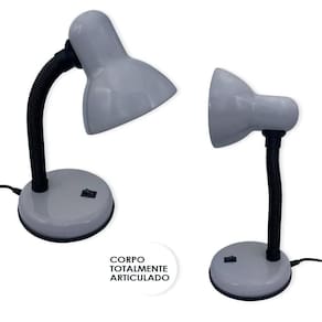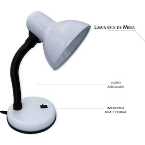 Luminária de Mesa Articulada Bivolt Manicure Escritório Luminária de Mesa Articulada Bivolt Manicure Escritório ============================================================ Essa luminária é perfeita para usar em mesas, bancadas, escritórios, ideal para leitura ou digitação em lugares com pouca luminosidade. Deixe sei cantinho mais iluminado e prático. ============================================================ Contém: 01 Unidade Especificações: - Material: Metal, Polipropileno e Componentes Eletrônicos - Medida: 30cm x 14,5cm - Tomada: 02 Pinos - Articulável: Sim - Voltagem; Bivolt - Bocal: Padrão Brasileiro E27 - Botão Liga / Desliga: Sim - Cor enviada de forma aleatória conforme disponibilidade em ============================================================ Devido à diferença entre monitores e iluminação diferentes, pode haver variação na tonalidade apresentada no anúncio. Medidas muito aproximadas.