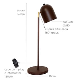 A luminária de mesa Britney é a escolha perfeita para quem busca uma iluminação direcionada e elegante. Com seu design moderno e funcional, ela se adapta a diversos ambientes, tanto em casa quanto no escritório. Características que fazem a diferença: Design versátil: A cúpula articulada em 180° permite direcionar a luz exatamente onde você precisa, ideal para leitura, trabalho ou destacar objetos decorativos.Construção robusta: Fabricada em alumínio e ferro com pintura eletrostática, garantindo durabilidade e resistência, inclusive em ambientes com maresia.Iluminação eficiente: O soquete GU10 é compatível com diversas opções de lâmpadas LED (não inclusas).Facilidade de uso: O cabo com plug e interruptor integrado de 180cm facilita o manuseio e a instalação.Bivolt: Adapta-se a qualquer tomada, sem a necessidade de adaptador. Ideal para: Escritórios: Ilumine sua mesa de trabalho de forma eficiente e confortável.Quartos: Crie um ambiente de leitura aconchegante.Salas de estar: Destaque objetos decorativos e crie pontos de luz estratégicos.Ambientes externos cobertos: Sua resistência à maresia permite o uso em áreas externas protegidas. Por que escolher a Luminária Britney? Design moderno: Se adapta a diversos estilos de decoração.Funcionalidade: Iluminação direcionada e ajustável.Durabilidade: Construída para durar.Versatilidade: Ideal para diversos ambientes.Fácil instalação: Pronta para uso.