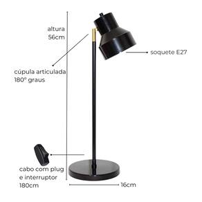 A Luminária de Mesa Cate é mais do que apenas uma fonte de luz. É uma peça de design que combina a elegância do metal com a funcionalidade da iluminação direcionada. Perfeita para quem busca um toque sofisticado em seus ambientes. Características que fazem a diferença: Design atemporal: As linhas clean e o acabamento impecável da Cate a tornam uma peça atemporal, que se adapta a diversos estilos de decoração.Material de alta qualidade: Construída em alumínio e ferro com pintura eletrostática, a Cate é resistente à corrosão, garantindo durabilidade e beleza por muitos anos.Iluminação versátil: O soquete E27 permite a utilização de uma ampla variedade de lâmpadas LED (não inclusas).Articulação precisa: A cúpula articulada em 180° permite direcionar a luz exatamente onde você precisa, ideal para leitura, trabalho ou destacar objetos decorativos.Facilidade de uso: O cabo com plug e interruptor integrado de 180cm facilita a instalação e o manuseio.Bivolt: Adapta-se a qualquer tomada, sem a necessidade de adaptador.Resistente à maresia: Sim.Cuidados e Manutenção: Para preservar a luminária, utilize um pano seco e macio para limpeza. Evite o uso de produtos abrasivos e solventes que possam danificar o acabamento. Ideal para: Escritórios: Crie um ambiente de trabalho moderno e inspirador.Quartos: Ilumine sua cabeceira e adicione um toque industrial à decoração.Salas de estar: Destaque obras de arte ou crie pontos de leitura aconchegantes.Ambientes comerciais: Proporcione uma iluminação elegante e funcional em lojas, restaurantes e hotéis. Por que escolher a Luminária Cate? Design industrial: Um toque de sofisticação para qualquer ambiente.Durabilidade e resistência: Construída para durar.Versatilidade: Ideal para diversos ambientes e estilos de decoração.