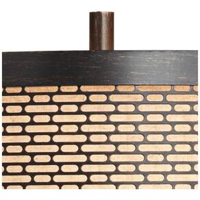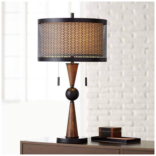 Usa duas lâmpadas de base padrão média máxima de 60 watts não incluídas. Interruptores de correntes de tração dupla. Candeeiro de mesa rústico moderno contemporâneo da marca Franklin Iron Works. Acabamentos em metal bronze e madeira de cerejeira. Construção em metal e madeira. Design de sombra de tambor duplo, com uma sombra externa de linho marrom e uma sombra externa de metal com acabamento em bronze antigo