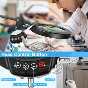 - ?Botão de cabeça atualizado?A lupa de mesa com luz possui um botão de cabeça atualizado para uma operação sem complicações. Ao contrário de outras lâmpadas de mesa de aumento com interruptores no cabo de alimentação, nosso botão de cabeça permite um controle fácil e intuitivo. O braço oscilante ajustável permite que você escolha o ângulo desejado. As lupas com luz para trabalho próximo facilitam a operação dos botões para ajustar os 5 modos de cor e brilho de escurecimento contínuo.
