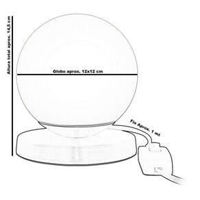 Com aproximadamente 12 cm de base, 12 cm de largura x 12 de altura da bola, totalizando aproximadamente 14,5 cm de altura total da luminária