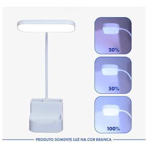 ESPECIFICAÇÕES TÉCNICAS Nome do produto: Luminária de Mesa LED Recarregável com Suporte para Celular Categoria: Iluminação / Acessórios para Escritório Material principal: Plástico ABS Acabamento: Branco/Gelo (estrutura), Branco (cúpula) Dimensões (A x L x P): 20 cm x 15 cm x 15 cm Cores disponíveis: Branco/Gelo Capacidade / Volume: Bateria 1200 mAh Itens inclusos: 01 luminária, 01 cabo USB, 01 manual Método de instalação: Pronto para uso Compatibilidade: Dispositivos móveis com até 8 cm de largura Uso recomendado: Interno Normas e certificações: Eficiência energética classe A