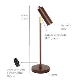 Fabricante: Lumim, BrasilDesigner: Lumim A luminária de mesa Margot é a escolha perfeita para quem busca um design moderno e funcional, com a versatilidade de iluminar seus ambientes de diversas formas. Construída com materiais de alta qualidade e acabamento impecável, a Margot é a peça que faltava para completar sua decoração. Características: Design moderno e articulado: A cúpula da Margot possui uma articulação de 180°, permitindo direcionar a luz exatamente onde você precisa, seja para iluminar sua área de trabalho, para criar um ambiente de leitura aconchegante ou para destacar objetos de decoração.Construção robusta: Fabricada em alumínio e ferro com pintura eletrostática.Iluminação eficiente: O soquete G10 permite a utilização de lâmpadas LED (não inclusas), proporcionando uma iluminação suave e eficiente.Prática e versátil: possui um cabo com plug e interruptor, com 180cm de comprimento, facilitando o uso e a instalação. Fácil de limpar: Para preservar a beleza da sua luminária, basta utilizar um pano seco e macio para a limpeza. Evite o uso de produtos abrasivos e solventes que possam danificar o acabamento. Especificações técnicas: Material: Alumínio e ferroPintura: EletrostáticaSoquete: G10Articulação da cúpula: 180°Lâmpada: LED (não inclusa)Tensão: BivoltCabo: 180cm com plug e interruptorResistente à maresia: SimÁreas indicadas para uso: Interna Por que escolher a Luminária Margot? Design moderno e versátil: Se adapta a diversos estilos de decoração.Iluminação direcionável: Crie o ambiente perfeito para suas necessidades.Construção robusta e durável: Garante longa vida útil.