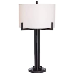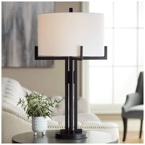 Leva uma lâmpada de base padrão de 150 watts não incluída. Interruptor do soquete liga, desliga. Candeeiro de mesa industrial moderno da Franklin Iron Works. Acabamento preto. Construção metálica. Sombra de tambor branco Marca: Não Informado