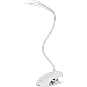 Luminária articulada de mesa com 14 LEDs brancos com intensidade de luz ajustável. Possui clip para prender a luminária em prateleiras.
