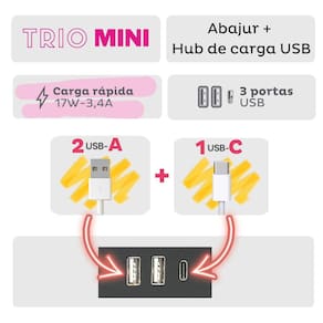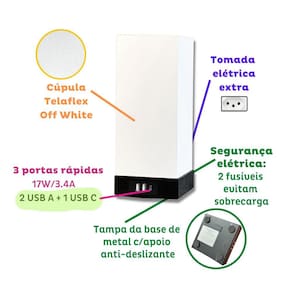- 3 portas USB de carga rápida - 17W/3.4A:carregamento de múltiplos dispositivos simultaneamente, mesmo com a luminária desligada (lâmpada não inclusa). Carga rápida equivalente aos mais potentes carregadores do mercado. Única no mercado com 3 portas sendo 2 USB A ( conector tradicional e padrão, utilizado nas portas de computadores, impressoras e HDs externos) + 1 USB C ( conector menor, reversível, mais moderno e versátil, utilizado em smartphones, laptops, tablets, automóveis etc.). Rapidez de carregamento equivalente aos mais potentes carregadores do mercado.