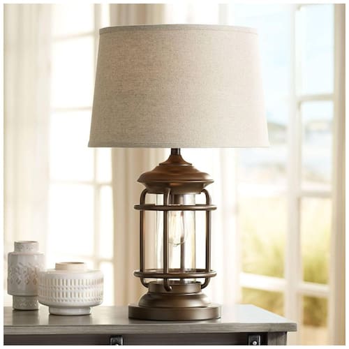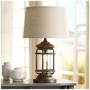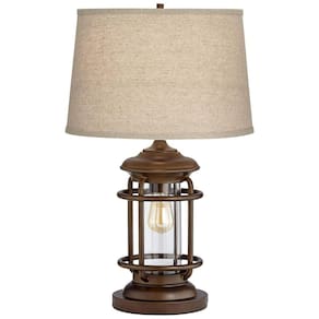 Usa uma lâmpada de base média padrão máxima de 150 watts não incluída. Inclui uma lâmpada de filamento LED estilo Edison de 4 watts para a luz noturna. O interruptor de soquete giratório de 4 vias oferece controle de iluminação fácil luz superior acesa, inferior acesa, ambas acesas, ambas apagadas. Candeeiro de mesa USB com design da marca Franklin Iron Works. Carregue facilmente telefones inteligentes. USB avaliado em eres. Base estilo lanterna. Construção metálica. Vidro transparente. Sombra de tecido de aveia Marca: Não Informado