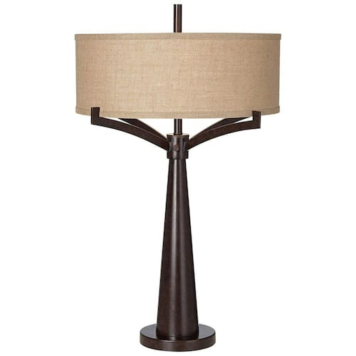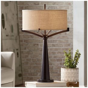 O interruptor de soquete de botão de 4 vias oferece controle de iluminação fácil uma lâmpada acesa, outra lâmpada acesa, ambas acesas, ambas apagadas. Candeeiro de mesa rústico moderno inspirado em designs industriais e Arts and Crafts da marca Franklin Iron Works. Acabamento de bronze Allegheny sobre um corpo de lâmpada de metal Marca: Não Informado