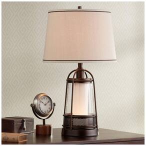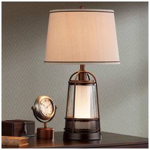 Usa uma lâmpada de base padrão máximo de 100 watts para luz superior não incluída. Inclui uma lâmpada LED de 2 watts para a luz noturna. Candeeiro de mesa industrial rústico fazenda com luz noturna da marca de iluminação Franklin Iron Works. Vidro exterior semeado com um envoltório de malha perfurada. Difusor de vidro branco interno. Construção metálica com acabamento em bronze. Abajur off white com detalhes em marrom. Cabo marrom de 6 pés de cumprimento e plugue Marca: Não Informado