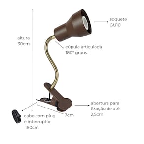 Fabricante: Lumim, BrasilDesigner: Lumim Com uma abertura máxima de 2,5 cm, a presilha da Amélia Mini se adapta a uma variedade de superfícies, desde prateleiras finas até móveis mais robustos. Direcione a luz exatamente onde você precisa, criando um ambiente personalizado e funcional. Seja para destacar obras de arte, iluminar sua bancada de trabalho ou criar um ponto de leitura aconchegante, a Amélia Mini é a solução perfeita. Seja você um amante da decoração, um arquiteto exigente ou um designer de interiores em busca de soluções inovadoras, a Amélia Mini é a escolha ideal. Design Atemporal com Toque Contemporâneo A Amélia Mini apresenta um design clean e minimalista, que se adapta a diversos estilos de decoração. Sua estrutura em alumínio e ferro, com pintura eletrostática de alta qualidade, garante durabilidade e resistência. A articulação da cúpula em 180º permite direcionar a luz exatamente onde você precisa, oferecendo versatilidade e praticidade. Iluminação Sofisticada e Versátil Com seu soquete G10, a Amélia Mini é compatível com diversas opções de lâmpadas LED (não inclusas), permitindo que você personalize a iluminação de acordo com suas necessidades e preferências. Seja para criar um ambiente aconchegante e intimista ou para destacar objetos de decoração, a Amélia Mini se adapta a qualquer situação. Resistência e Durabilidade Projetada para resistir aos desafios do dia a dia, a Amélia Mini é resistente à maresia (exceto o flexível). Seu cabo com plug e interruptor de 180cm proporciona praticidade e segurança. Destaques: Design atemporal e versátil: Se adapta a diversos estilos de decoração.Construção robusta: Alumínio e ferro com pintura eletrostática.Articulação da cúpula: Direciona a luz com precisão.Compatível com lâmpadas LED: Personalize a iluminação.Resistente à maresia: Ideal para ambientes úmidos.Fácil instalação: Plug e interruptor integrados.Manutenção simples: Limpeza com pano seco. Onde usar: A Amélia Mini é perfeita para: Escritórios: Ilumine sua mesa de trabalho com estilo e praticidade.Quartos: Crie um ambiente aconchegante e relaxante.Salas de estar: Destaque objetos de decoração e crie pontos de luz estratégicos.Cozinhas: Ilumine bancadas e áreas de preparo de alimentos.Áreas externas cobertas: Leve a elegância da Amélia Mini para sua varanda ou área gourmet. Cuidados: Para garantir a durabilidade da sua Amélia Mini, siga as seguintes recomendações: Limpe com um pano seco e macio.Evite o uso de produtos abrasivos e solventes.Não exponha a luminária à água ou umidade excessiva.