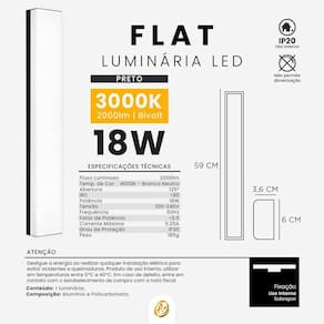Cor: Preto Temperatura de cor: 3000K - Branco Quente Fluxo luminoso: 2000lm Potência: 18W Frequência: 60Hz Fator de Potência: 0.5 Tensão: 100-240V Bivolt Temperatura de operação: 0C a 40C Eficiência Luminosa: 110lm/W Ângulo: 125 IRC: 80 UGR: 28 Grau de Proteção: IP20 Peso: 185g Dimensões: 590 x 60 x 36mm Marca: Não Informado