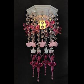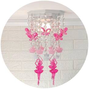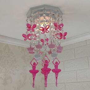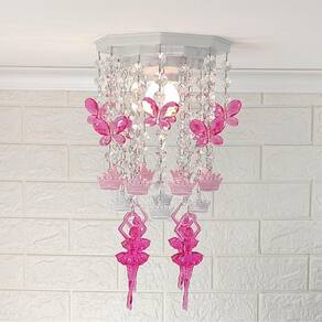 Base Plafon Octogonal de 17 cm em acrílico na cor branca x Altura do lustre 35 cm; Castanhas de acrílico transparente e cor rosa; Borboletas de acrílico cor rosa; Bailarinas de acrílico cor rosa; Coroas de acrílico cor rosa e branca; Voltagem: bivolt 127v 220v Lustre enviado montado pronto para instalação; Lâmpada não inclusa; Marca: Não Informado