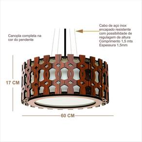 Luminária Decorativa Madeira Pendente Encantadas 60cm Cor: Pau Ferro A iluminação certa pode transformar um ambiente, deixando-o mais requintado, confortável e aconchegante. Nossas luminárias são criadas e desenvolvidas com a intenção fazer essa transformação, pois são construídas com material de primeira e com projetos muito bem elaborados, unindo beleza, funcionalidade e bom gosto. Conseguimos com elas, fazer o casamento do acrílico, alumínio e madeira de maneira harmônica. ------------------------------------------------------------------------------------- ESPECIFICAÇÕES TÉCNICAS ------------------------------------------------------------------------------------- DIMENSÕES: Comprimento: 60 cm Largura: 60 cm Altura: 17 cm Peso: 3 kg Qtde de lâmpadas: 4 led 6 a 15 W Alimentação: Bivolt 110/220 MATERIAL: Difusor em acrílico leitoso Mdf primeira qualidade Soquete E27 Cabo de aço para sustentação medindo 1,5 mts 1,5mm espessura Fio de ligação cobre 1,5mm Acessórios de fixação e sustentação Cor mdf: Pau Ferro Limpeza: Utilizar um pano macio flanela levemente umedecido com água ou lustra móveis : 6 meses contra defeito de fabricação. Marca: Creatus ------------------------------------------------------------------------------------- AMBIENTES ------------------------------------------------------------------------------------- --- RESIDENCIAIS Nossas luminárias podem ser instaladas em qualquer cômodo da casa, pois com certeza tornará o ambiente mais bonito e harmonioso. -- EMPRESAS As nossas luminárias também tem a função de alegrar ambientes empresariais, pois deixam o ambiente mais leve bonito e suave. ------------------------------------------------------------------------------------- EMBALAGEM ------------------------------------------------------------------------------------- Nossas luminárias são muito bem embaladas, fazendo com que os riscos no transporte sejam reduzidos a quase nada. Caso acontecer um eventual dano no transporte, fazemos a reposição sem custo. ------------------------------------------------------------------------------------- OBSERVAÇÃO ------------------------------------------------------------------------------------- - Lâmpadas não inclusas - Utilizar somente lâmpadas de LED - Acompanha manual de instalação - Acompanham os soquetes e o fio necessário para a instalação da luminária na rede elétrica. - Uso exclusivo para ambiente interno Ean: 7893804009170