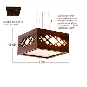Luminária decorativa madeira pendente pipa 45cm Cor: pau ferro A iluminação certa pode transformar um ambiente, deixando-o mais requintado, confortável e aconchegante. Nossas luminárias são criadas e desenvolvidas com a intenção fazer essa transformação, pois são construídas com material de primeira e com projetos muito bem elaborados, unindo beleza, funcionalidade e bom gosto. Conseguimos com elas, fazer o casamento do acrílico, alumínio e madeira de maneira harmônica.