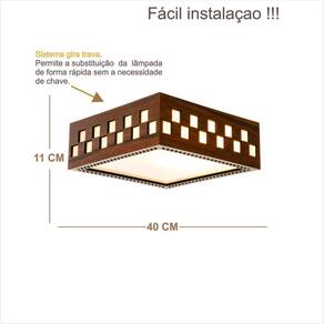 Luminária decorativa madeira plafon enseada quad 30cm Cor: pau ferro A iluminação certa pode transformar um ambiente, deixando-o mais requintado, confortável e aconchegante. Nossas luminárias são criadas e desenvolvidas com a intenção fazer essa transformação, pois são construídas com material de primeira e com projetos muito bem elaborados, unindo beleza, funcionalidade e bom gosto. Conseguimos com elas, fazer o casamento do acrílico, alumínio e madeira de maneira harmônica. Especificações técnicas Dimensões: Comprimento: 30cm Largura: 30 cm Altura: 11 cm Peso: 2,5 kg Qtde de lâmpadas: 2 led 6 a 15 w Alimentação: bivolt 110/220 Material: Difusor em acrílico leitoso Mdf primeira qualidade Soquete e27 Fio de ligação cobre 1,5mm Acessórios de fixação e sustentação Cor mdf: marron pf Limpeza: utilizar um pano macio flanela levemente umedecido com água ou lustra móveis Garantia: 6 meses contra defeito de fabricação. Marca: creatus Ambientes Residenciais Nossas luminárias podem ser instaladas em qualquer cômodo da casa, pois com certeza tornará o ambiente mais bonito e harmonioso. Empresas As nossas luminárias também tem a função de alegrar ambientes empresariais, pois deixam o ambiente mais leve bonito e suave. Embalagem Nossas luminárias são muito bem embaladas, fazendo com que os riscos no transporte sejam reduzidos a quase nada. Caso acontecer um eventual dano no transporte, fazemos a reposição sem custo. Observação - lâmpadas não inclusas - utilizar somente lâmpadas de led - acompanha manual de instalação - acompanham os soquetes e o fio necessário para a instalação da luminária na rede elétrica. - uso exclusivo para ambiente interno