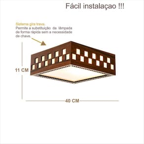 Luminária decorativa madeira plafon enseada quad 40cm Cor: pau ferro A iluminação certa pode transformar um ambiente, deixando-o mais requintado, confortável e aconchegante. Nossas luminárias são criadas e desenvolvidas com a intenção fazer essa transformação, pois são construídas com material de primeira e com projetos muito bem elaborados, unindo beleza, funcionalidade e bom gosto. Conseguimos com elas, fazer o casamento do acrílico, alumínio e madeira de maneira harmônica.