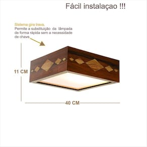 DIMENSÕES: Comprimento: 40cm Largura: 40 cm Altura: 11 cm Peso: 3,5 kg Qtde de lâmpadas: 3 led 6 a 15 W Alimentação: Bivolt 110/220