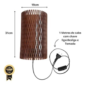 Atenção não acompanha lampada Produtos desenvolvidos dentro dos mais elevados padrões de qualidade. Além de serem um elemento especial na iluminação auxiliar, valorizam e atribuem mais elegância ao seu espaço e a sua decoração. Descrição: Produto em madeira/mdf Inclui bucha e parafuso pequeno para instalação Soquete: e 27 Pronto para instalar, modelo de parede Não inclui lâmpada 100 cm de fio Bivolt 110 v/220 v , potência: 100 w Capacidade de lâmpada: 1 unidade de 1 meses contra defeito de fabricação. Fabricado com mdf 3mm com pelicula marrom premium Dimensões: Altura = 31 cm Largura = 19 cm