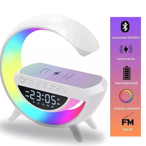 Principais perguntas sobre o produto e respostas: 1 este produto funciona com dispositivos android e ios Sim, o carregamento por indução é compatível com dispositivos android e ios. 2 quantos modos de iluminação este dispositivo possuiEle possui 7 modos de iluminação diferentes. 3 a luminária tem rádio fmSim, a luminária inclui rádio fm para mais opções de entretenimento. 4 quanto tempo dura a bateriaA duração da bateria depende do uso, mas possui uma longa duração em modo standby. 5 é necessário usar pilhas para este dispositivo não, este modelo possui bateria interna recarregável e acompanha cabo usb tipo c para carregamento. 6 qual é a distância máxima de transmissão do bluetoothA distância máxima de transmissão do bluetooth é aproximadamente 10 metros. Marca: AL