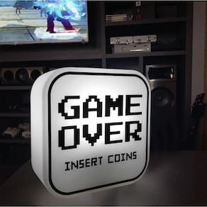 Eleve o nível do seu setup game com a Luminária Game Over. Super moderna, vai iluminar o cantinho favorito de relaxamento e diversão. A Luminária pode ficar sobre a mesa ou ser fixada na parede, e na parte de trás dela tem a marcação de onde pode ser furada para prender na parede.Material: Polietileno Dimensões: 23 x 23 x 9cm Tensão: 110V/220V Fonte de Alimentação: Cabo de força com interruptor medindo 1,8m de comprimento Informações de conservação: Limpar com pano úmido e macio. Não utilizar produtos químicos e abrasivos. Não utilizar lâmpadas incandescentes de qualquer tipo. Perguntas Frequentes: - Qual tipo de lâmpada pode ser usada? Você pode utilizar lâmpadas compactas fluorescentes até 15W ou LED compatível com abertura inferior da luminária (E-27).