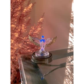 Detalhes: 10 cm de altura; 8 cm de diâmetro; Base de Plástico na cor ouro envelhecido; Imagem de acrílico; Detalhes dourados; LED na cor Azul; Funciona com 1 bateria, já inclusa.