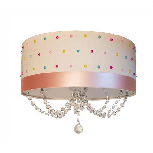 Luminária plafon pérolas coloridas 40x15 Modelo de sobrepor; ideal para compor a decoração do quarto, proporcionando uma boa iluminação; Cúpula produzida em psai de alto impacto com acabamento em tecido de algodão na tonalidade cru e detalhes de fita em laminado pet flexível com meia pérolas coloridas alocadas por toda a extremidade da cúpula. Faixa em pet cor rosa Capacidade para 2 lâmpadas rosca comum led e-27 12w não inclusas Fechamento total Correntes com cristais k9 e bola 30mm k9; Embalagem: caixa de papelão