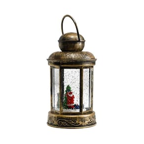 Luminária em forma de lamparina de 19 cm de altura. Interior com enfeite no formato de Papai Noel com uma mulher mexendo na árvore de natal. Duas opções para ligar. Ao ligar de um lado, interior da lamparina se acende e líquido interno começa a se movimentar mexendo a purpurina que tem dentro. Ao ligar para outro lado, além do descrito anteriormente, começa a tocar música natalina.Material: Plástico, líquido e resina; Fontes de alimentação: Cabo USB incluso no produto ou 3 pilhas AAA não incluso ;Medidas: 10x10x19 cm;Peso: 700 gramas.