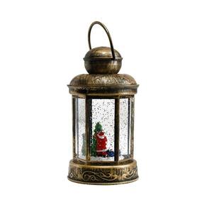 Luminária em forma de lamparina de 19 cm de altura. Interior com enfeite no formato de Papai Noel com uma mulher mexendo na árvore de natal. Duas opções para ligar. Ao ligar de um lado, interior da lamparina se acende e líquido interno começa a se movimentar mexendo a purpurina que tem dentro. Ao ligar para outro lado, além do descrito anteriormente, começa a tocar música natalina.Material: Plástico, líquido e resina; Fontes de alimentação: Cabo USB incluso no produto ou 3 pilhas AAA não incluso ;Medidas: 10x10x19 cm;Peso: 700 gramas.