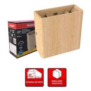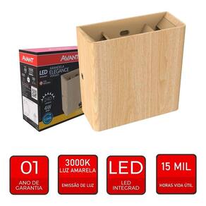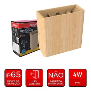 Características Adicionais: Luminária LED tipo arandela com acabamento efeito madeira Indicada para uso interno e externo (IP65) Potência de 4W com fluxo luminoso de 240 lúmens Corpo e difusor em policarbonato Ângulo de abertura ajustável de 10° a 90° Instalação por sobrepor Baixo consumo de energia Fator de potência: 0,50 Temperatura ambiente de operação: -5°C a 40°C 1 ano de garantia