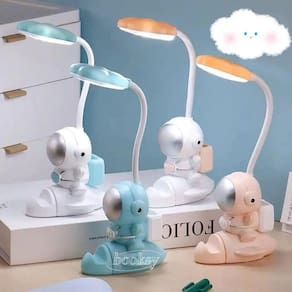 Luminária de Led carregável em USB, com bolsinho atrás para colocar lápis, canetas, etc e serve como porta-celular. Botão Liga-desliga