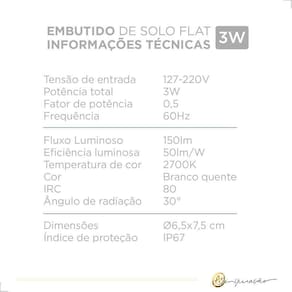 Tensão de entrada:127-220V Potência total: 3W Fator de potência: 60Hz Fluxo luminoso: 150lm Eficiência luminosa: 50lm/W Temperatura de cor: 2700K Cor: Branco quente IRC: 80 Ngulo de radiação: 30 Dimensões: 6,5x8 cm Índice de proteção: IP67 Ean: 7908163127554