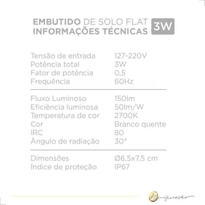 Tensão de entrada:127-220V Potência total: 3W Fator de potência: 60Hz Fluxo luminoso: 150lm Eficiência luminosa: 50lm/W Temperatura de cor: 2700K Cor: Branco quente IRC: 80 Ngulo de radiação: 30 Dimensões: 6,5x8 cm Índice de proteção: IP67 Marca: Não Informado