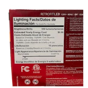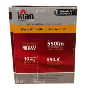 Especificações Técnicas: • Marca: Kian • Linha: Retrofit LED • Modelo: #8DL4DIM827LT1EL • Item: 80000 • Base: E26 • Potência: 8W • Fluxo luminoso: 550 lm • Cor da luz: 2700K Warm White • Equivalência: até 50W • Tensão: 120V • Dimerizável: Sim • IRC: 80 • Vida útil: 11.000 horas • Economia estimada: US$ 50,8 • Material: Policarbonato resistente • Aplicação: luminárias 5"/6", áreas internas e úmidas • Instalação: molas integradas • Certificações: FCC, ETL, Intertek • Garantia: 3 anos