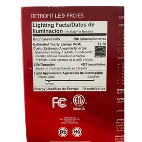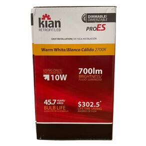 Especificações Técnicas: • Marca: Kian • Linha: Retrofit LED PRO ES • Modelo: #10DLS5/6DIM927LT50EL • EAN: 811037030034 • Potência: 10W • Equivalência: substitui 65W • Fluxo luminoso: 700 lm • Cor da luz: 2700K Warm White • IRC: 90 • Base: E26 • Tensão: 120V • Dimerizável: Sim • Vida útil: 45,7 anos (50.000 horas) • Economia estimada: US$ 302,5 • Instalação: luminárias 5"/6" • Áreas úmidas: adequado (wet location) • Material: policarbonato resistente a impactos • Certificação: Energy Star • Garantia: 5 anos