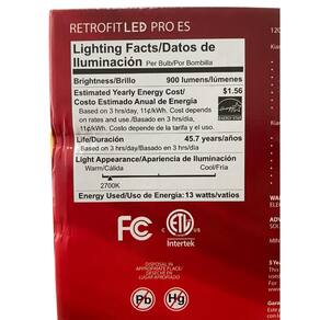 Especificações Técnicas: • Marca: Kian • Linha: Retrofit LED PRO ES • Modelo: #13DLS5/6DIM927LT50EL • EAN: 811037030041 • Potência: 13W • Fluxo luminoso: 900 lm • Cor da luz: 2700K Warm White • Base: E26 • Equivalência: até 75W • Tensão: 120V • IRC: 90 • Dimerizável: Sim • Vida útil: 50.000 horas (˜45,7 anos com uso de 3h/dia) • Economia estimada: US$ 341 • Aplicação: luminárias 5” e 6”; áreas úmidas • Instalação: molas integradas • Material: policarbonato resistente • Temp. mínima operação: -30°C • Certificações: Energy Star, FCC, ETL, Intertek • Garantia: 5 anos