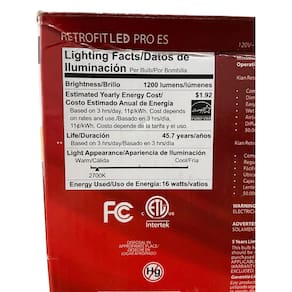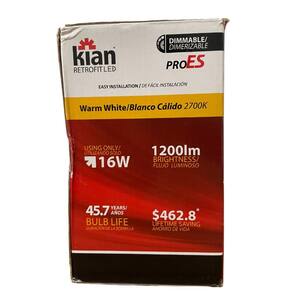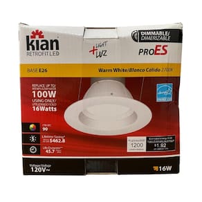 Especificações Técnicas: • Marca: Kian • Linha: Retrofit LED PRO ES • Modelo: #16DLS5/6DIM927LT50EL • EAN: 811037030058 • Base: E26 • Potência: 16W • Fluxo luminoso: 1200 lm • Cor da luz: 2700K Warm White • Equivalência: substitui 100W • Tensão: 120V • IRC: 90 • Dimerizável: Sim • Vida útil: 50.000h • Classificação: adequada para áreas úmidas • Instalação: luminárias 5" e 6" • Material: lente em policarbonato • Temperatura operacional: -20°C a 40°C • Garantia: 5 anos • Certificações: Energy Star, FCC, ETL, Intertek