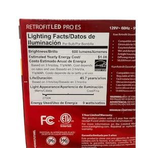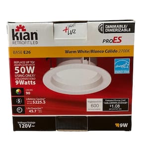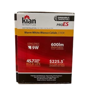 Especificações Técnicas: • Marca: Kian • Linha: Retrofit PRO ES • Modelo: #9DLS4DIM927LT50EL • EAN: 811037030027 • Base: E26 • Cor da luz: 2700K Warm White • Potência: 9W • Fluxo luminoso: 600 lm • Equivalência: até 50W • IRC: 90 • Tensão: 120V • Dimerizável: Sim • Vida útil: 50.000h • Instalação: Luminárias 5” e 6”; molas integradas • Uso: Áreas úmidas (wet location) • Material: Policarbonato resistente • Temperatura mínima: -30°C • Certificações: Energy Star, FCC, ETL, Intertek • Garantia: 5 anos