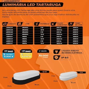 Luminária Led Tartaruga Foxlux 12w 3000k Luminária LED Tartaruga Branco Bivolt Luz Amarela FOXLUX Ilumine com conforto e segurança suas áreas externas utilizando a Luminária LED Tartaruga Branco da Foxlux. Projetada para oferecer uma iluminação amarelada suave, ela cria ambientes acolhedores em varandas, garagens, corredores, fachadas e muros. Seu design clássico de acabamento branco alia-se à robustez necessária para resistir às condições adversas do tempo graças ao grau de proteção IP65.