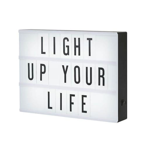 Coloque suas mensagens pessoais no centro das atenções com esta caixa de luz. São três painéis para inserir letras, ícones ou símbolos, permitindo que você coloque a frase que você quiser ou exiba seus ícones favoritos. Ideal para decoração possui um design moderno e retro, desperte sua criatividade e encante a todos com lindas frases motivadoras e de carinho. Seu material e de alta durabilidade e resistência, assim garantindo vida útil ao produto. -------------------------- Características: - Material: Polipropileno - Conexão USB; - Alimentação 3 pilhas AA não inclusas e cabo USB; - Possui letras, números e figuras; - Design moderno; - 90 Letras, numeros e simbolos