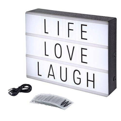 Luminária Led Lightbox Cinema A4 + 96 Letras e Números Coloque suas mensagens pessoais no centro das atenções com esta caixa de luz. São três painéis para inserir letras, ícones ou símbolos, permitindo que você coloque a frase que você quiser ou exiba seus ícones favoritos. Itens inclusos: - Luminária Light Box, - 96 slides letras, números e símbolos , - Cabo USB. Tamanho: - 30cm x 22cm x 4cm, - A4 Energia: - Cabo Usb Incluso ou Pilha AA Não inclusa Ean: 7854198742005