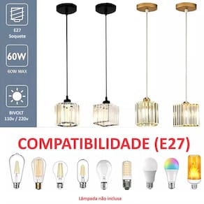 Especificações: Material: vidro / metal. Estrutura da luminária: 13cm diâmetro x 12cm altura. Cor: cristal transparente e acabamentos em metal. Quantidade de cristais: 15. Medidas cristal: 13 x 2cm. Cabo elétrico: 1,15m. Tensão: 110v / 220v bivolt . Ligação: corrente elétrica. Soquete: E27. Suporta até 1 lâmpada de 60 Watts não inclusa . Compatível com lâmpadas incandescentes, LED e CFL. Acompanha kit parafuso, buchas, arruelas e travessa. Medidas da caixa: 14 x 14 x 14cm. Peso: 600g. Modelo: KJDD-E-001. Marca: Gimpo.