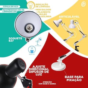 As luminárias de mesa são um detalhe de grande utilidade na nossa mesa de trabalho, leitura e estudos, elas nos garantem praticidade e conforto na hora de exercer atividades importantes. A luminária com base e garra garante ainda mais essa praticidade, deixando sua luminária mais firme.