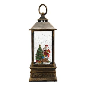 Luminária em forma de lamparina de 22 cm de altura. Interior com enfeite no formato de Papai Noel e árvore de natal. Duas opções para ligar. Ao ligar de um lado, interior da lamparina se acende e líquido interno começa a se movimentar mexendo a purpurina que tem dentro. Ao ligar para outro lado, além do descrito anteriormente, começa a tocar música natalina. Funcionamento: 1 cabo USB ou 3 pilhas AAA. Material: plástico, líquido e resina