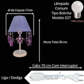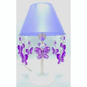 Cúpula de polipropileno plástico resistente na cor lilás; Base em acrílico branco haste de acrílico branco; Pingentes borboletas na cor lilás, castanhas de acrílico roxa e transparente; Altura total do abajur 30 cm. Diâmetro maior da cúpula mede 17 cm; Soquete para lâmpadas modelo e-27 bivolt aceita lâmpadas 110v e 220v ; Usar lâmpada de no máximo 40w lâmpada não incluso ; Marca: Lustres Sh Design Ean: 7806025230742